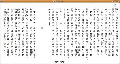 ブックリーダー用プログラム「XJP2」を青空文庫用にセットアップするのは、この記事でほとんどそのままズバリで出来ました。青空文庫を読みたいニーズは高いという事なのでしょう。実際のセットアップもほとんど問題なく完了しました(途中、ファイルがコピー出来ないとかってメッセージが出たような気がしますが、アプリケーション>アクセサリ>端末を起動し、「sudo nautilus」として起動したファイルブラウザでコピーすれば問題ありません)。