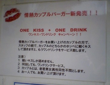 ワンドリンクのサービスです。このバーガーを買ったカップル同士でキスをすれば、ドリンクが1杯サービスになります。このサービスは、レギュラーサイズのバーガーでは食べ切れない彼女な人をターゲットにしているのでしょう。2個のバーガーならばスマートに分けあえますしね。でも、このサービス、同性同士のカップルでも良いそうです。